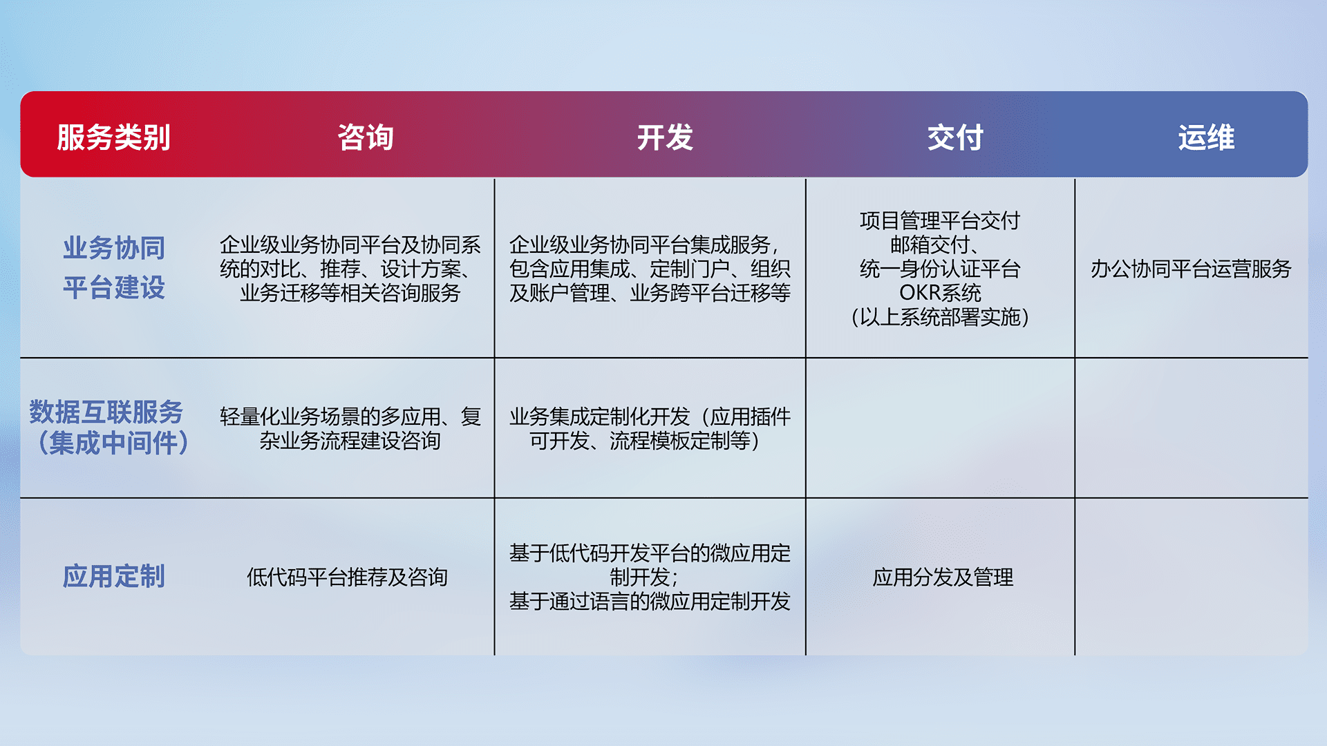 针对钉钉、、、、企微、、、IDaas等平台级产品提供产品的规划、、、方案、、交付、、、定制化开发等服务,,,,实现如统一协同办公、、、、智能客户服务、、、混合会议管理、、、智能数据查询、、等业务场景,,,实现数字化转型。。。